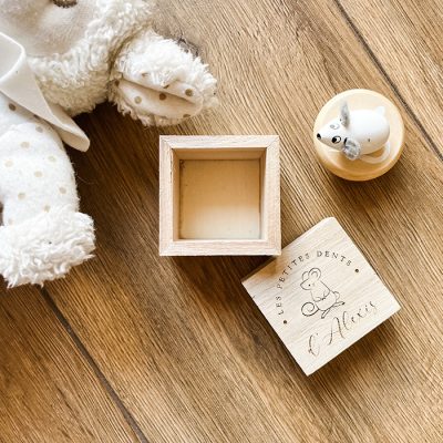 Boite à dents de lait pour garder un précieux souvenir du passage de la petite sourie, personnalisée avec le prénom de l’enfant, texte entièrement modifiable.
