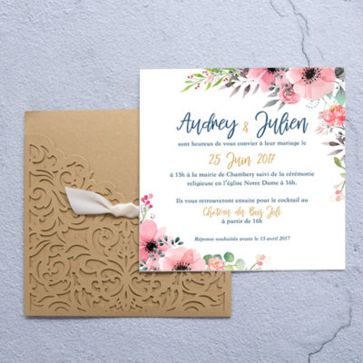 Le joli faire-part de mariage Pochette Ciselée découpe laser effet dentelle.