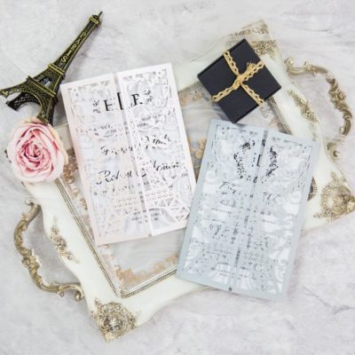 Le joli faire-part de mariage Pochette Ciselée découpe laser effet dentelle.