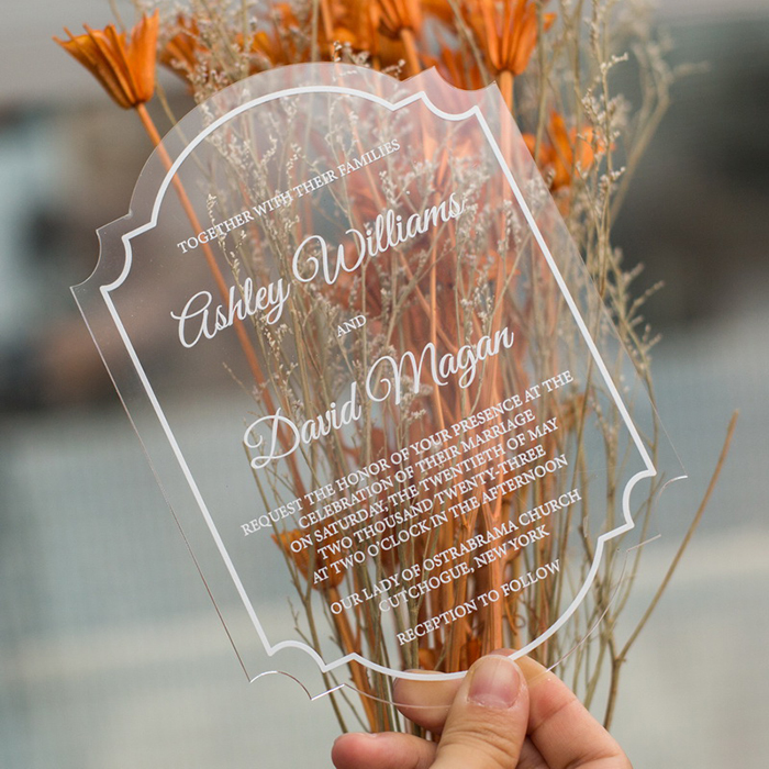 Le joli faire-part de mariage en plexiglass impression UV découpé forme baroque.