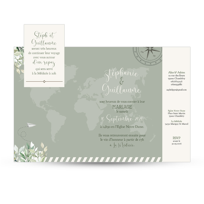 Le joli faire-part de mariage Sage Travel inspiration voyage végétal.