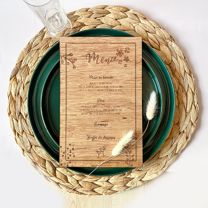 Menu mariage gravé sur bois, un support original et durable pour décoration de mariage naturelle, champêtre et bohème