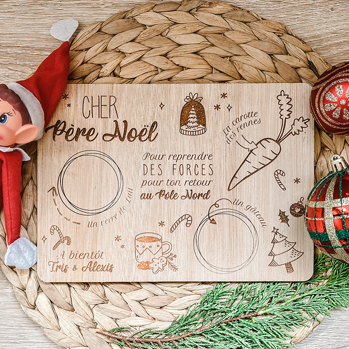 Le plateau du père noël, gravé sur bois et personnalisé au prénom des enfants, pour laisser un petit en-cas au père noël lors que sa nuit de travail, avec emplacement pour le biscuit, le verre de lait et la carotte des rennes.